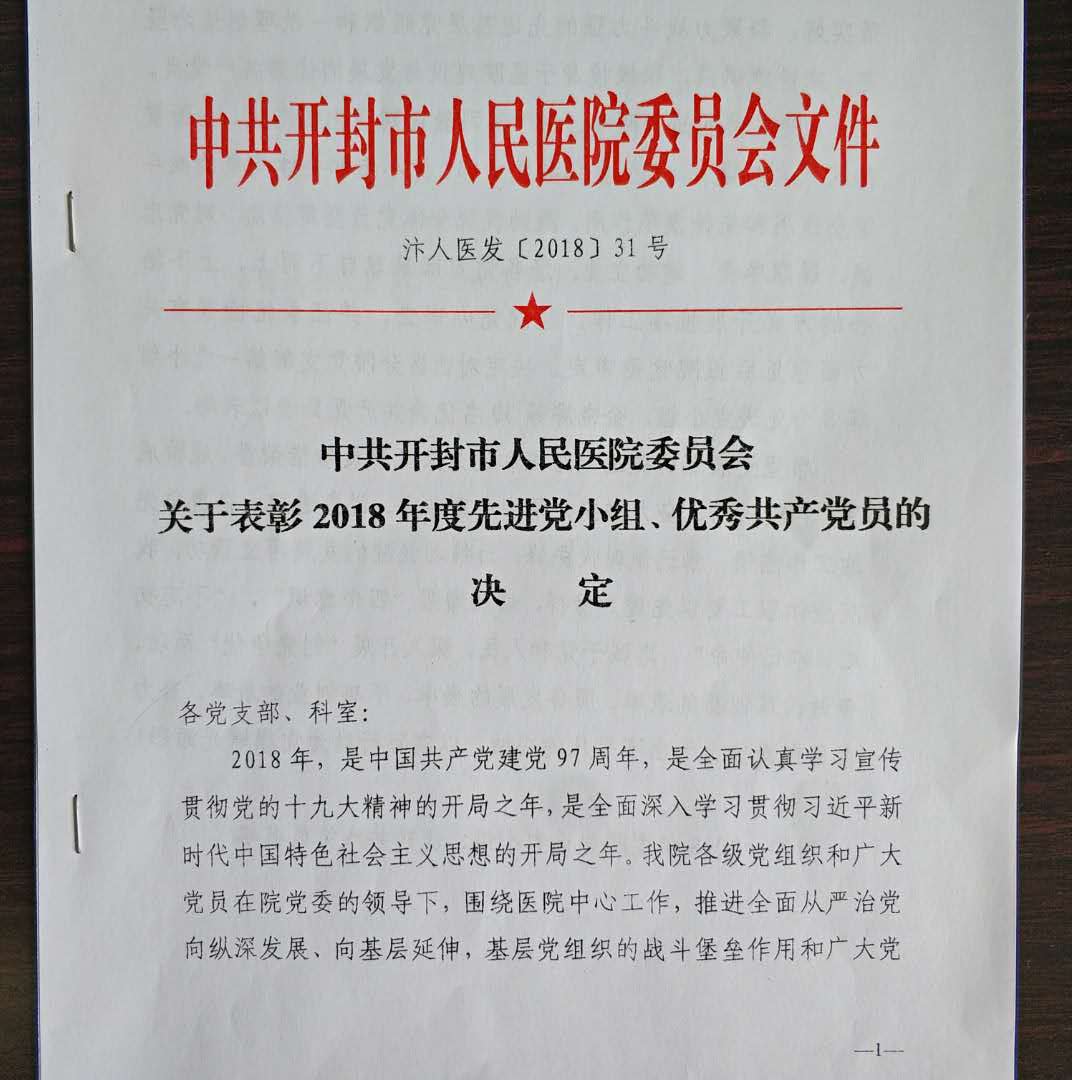 中共开封市人民医院委员会关于表彰2018年度先进党小组、优秀共产党员的决定